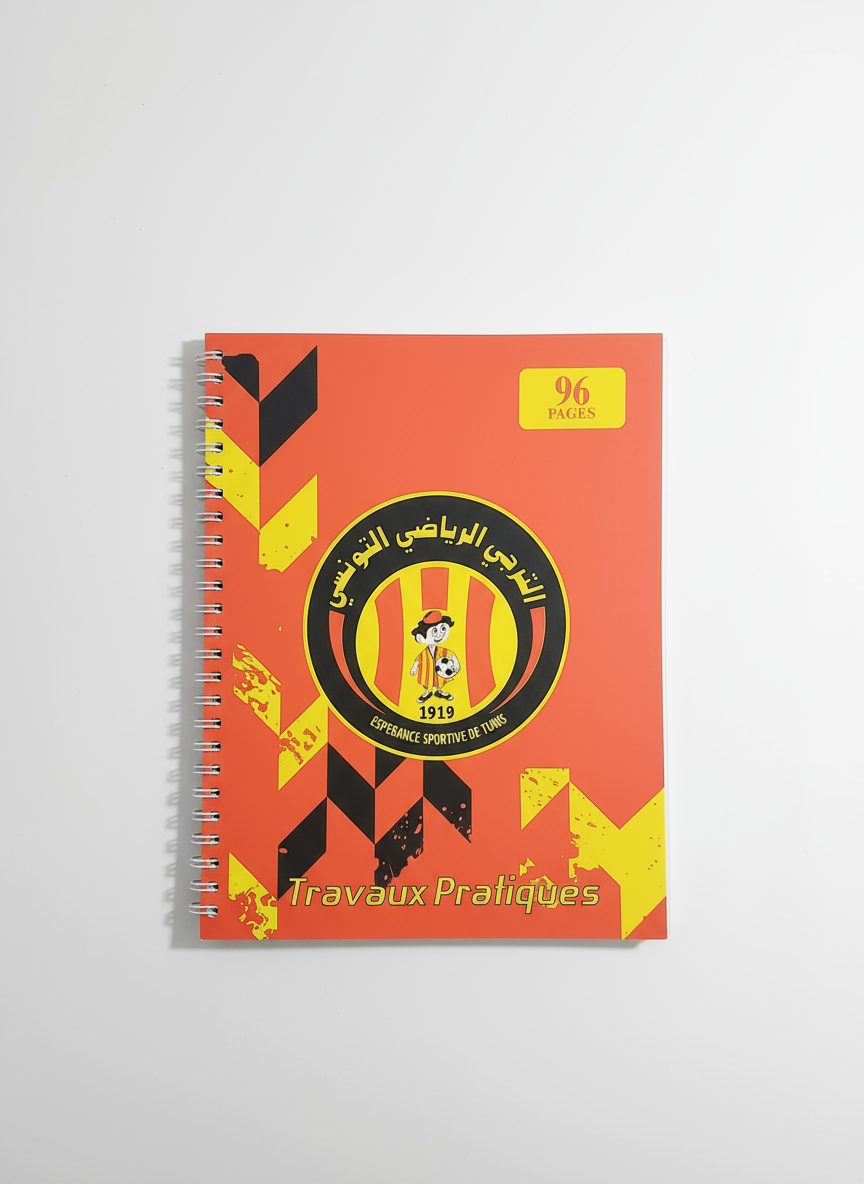 Ce Cahier TP Espérance 96 pages arbore une couverture graphique moderne, mettant à l’honneur le logo emblématique du club, ainsi qu’une mise en page dynamique aux accents rouges, noirs et jaunes. Contrairement à un cahier classique, celui-ci symbolise la fierté de représenter l’Espérance au quotidien.