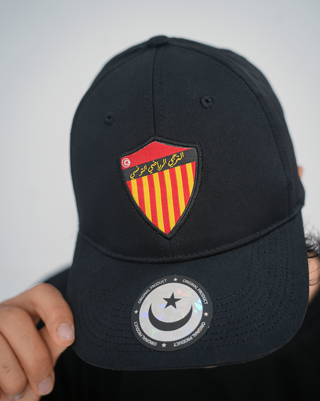 Le style minimaliste de cette casquette fait d’elle une pièce facile à porter, en toutes circonstances. Aucun texte visible, aucun artifice inutile : seul le blason vertical, brodé avec soin, s’affiche fièrement. Le logo reprend la forme classique du club, avec les bandes rouges et jaunes et le drapeau tunisien intégré dans le coin supérieur. Résultat : un accessoire discret mais puissant, qui parle à tous les supporters.