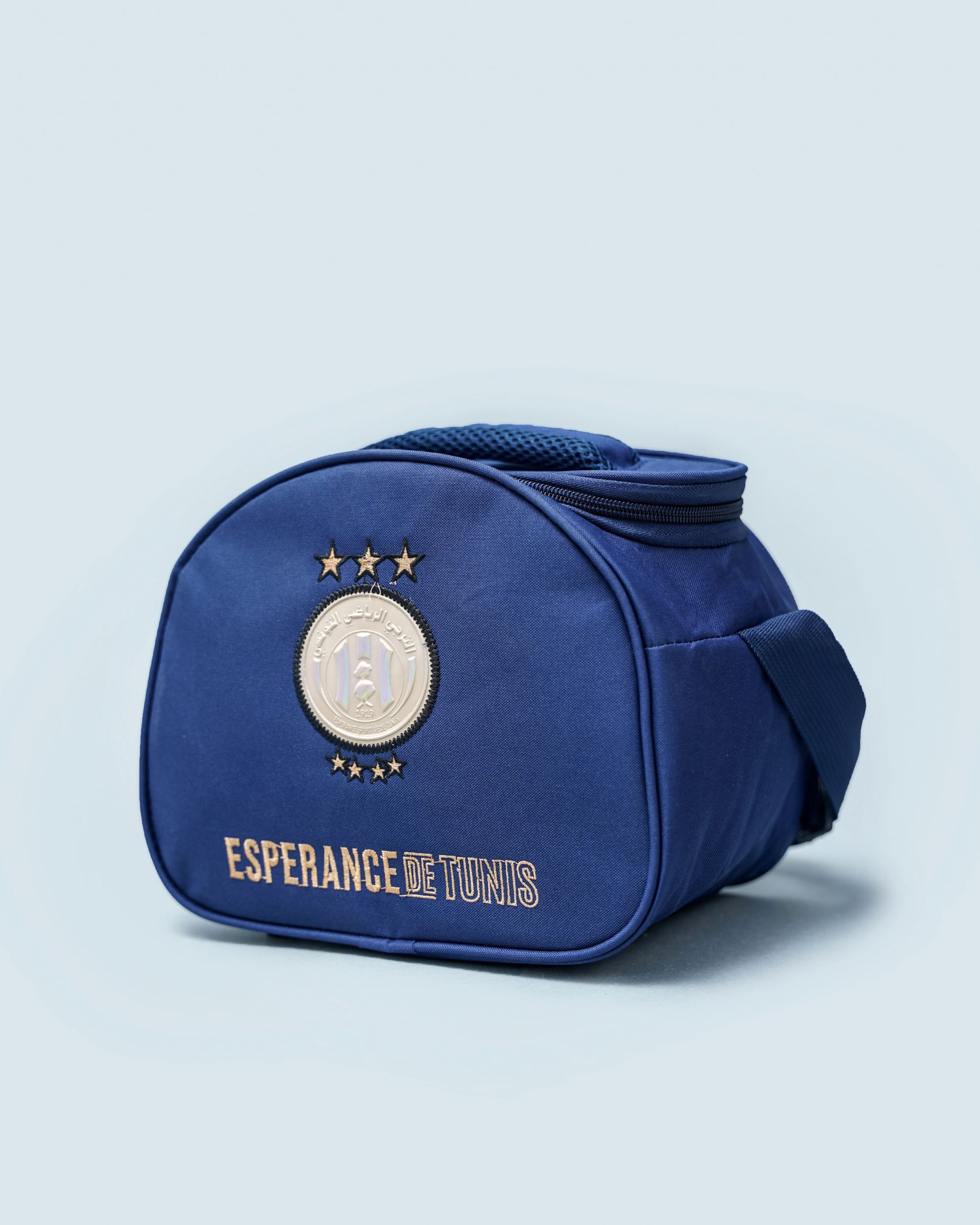 Disponible en bleu ou noir, ce panier séduit d’abord par sa forme arrondie et sa structure rigide, qui lui assurent une excellente tenue. Ensuite, l’avant du sac est marqué par un écusson brodé haut de gamme, accompagné des trois étoiles et de l’inscription « ESPERANCE DE TUNIS ». Ces éléments apportent une touche visuelle forte, sans tomber dans l’excès. En effet, le logo beige doré sur fond sombre crée un contraste chic et moderne, adapté à toutes les générations de supporters.