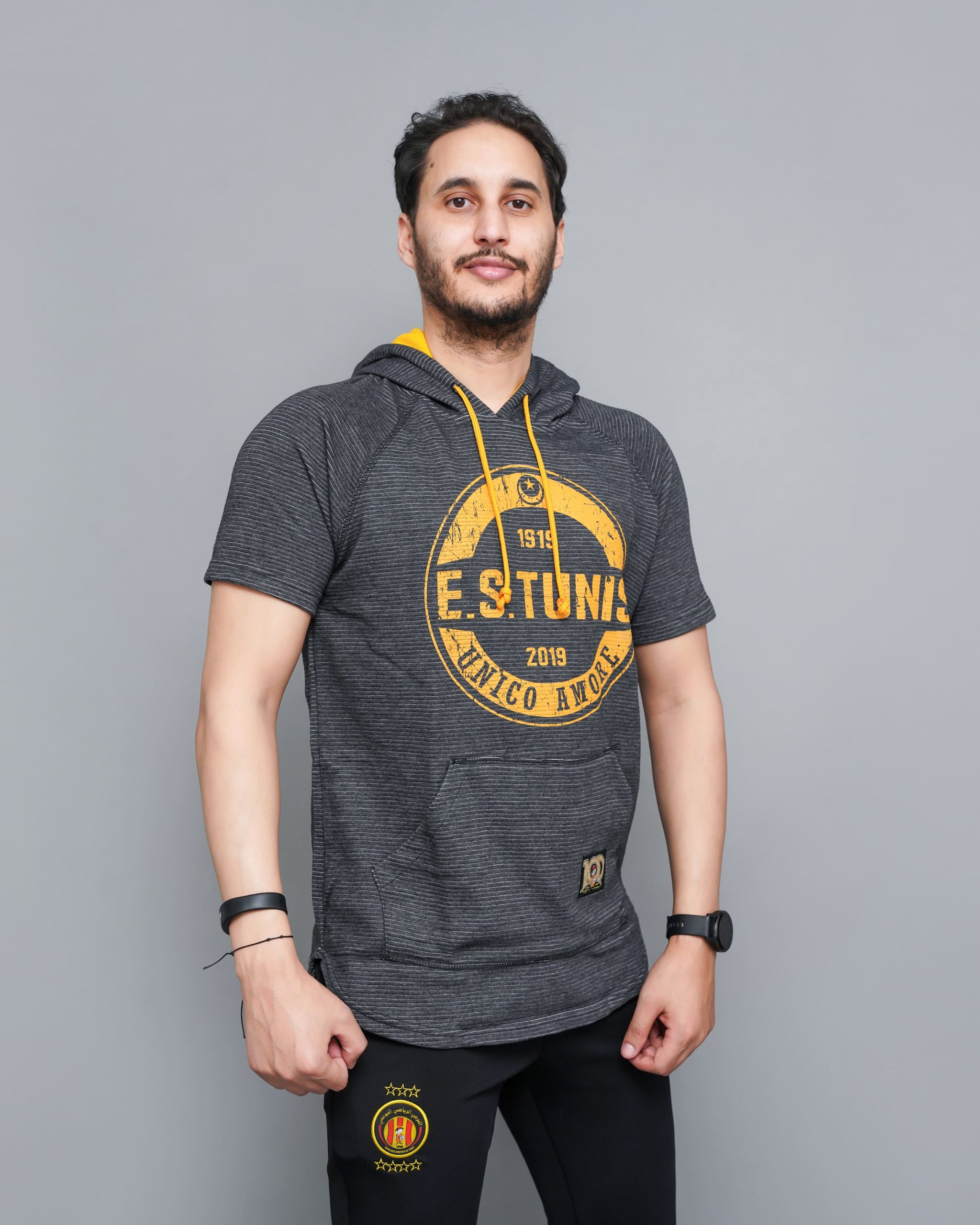 Son imprimé circulaire “E.S. TUNIS 1919” centré sur la poitrine affirme votre appartenance aux Sang et Or, tandis que la capuche à cordons contrastés rappelle les couleurs historiques de l’Espérance. C’est un vêtement idéal pour les demi-saisons ou pour compléter une tenue casual au quotidien.