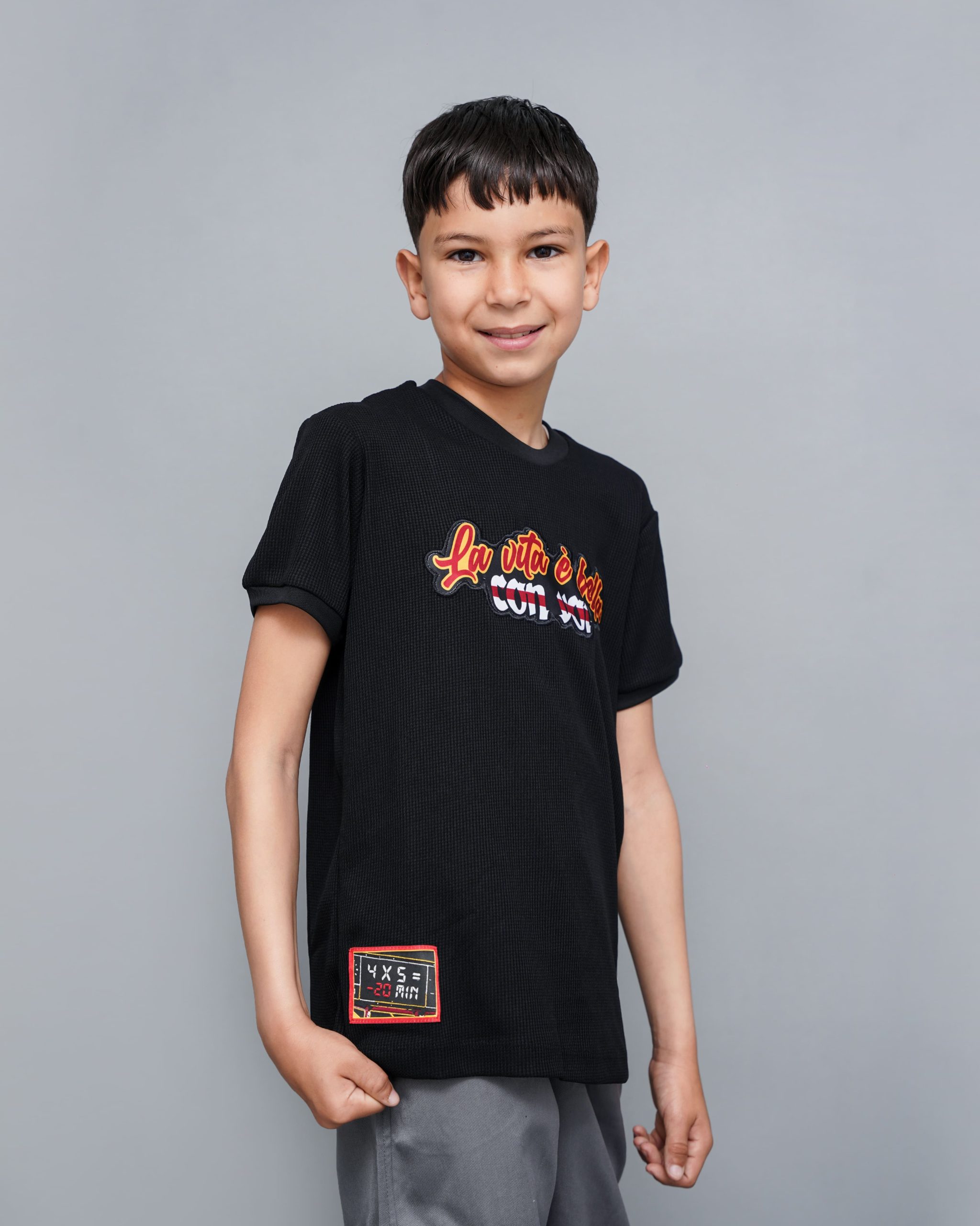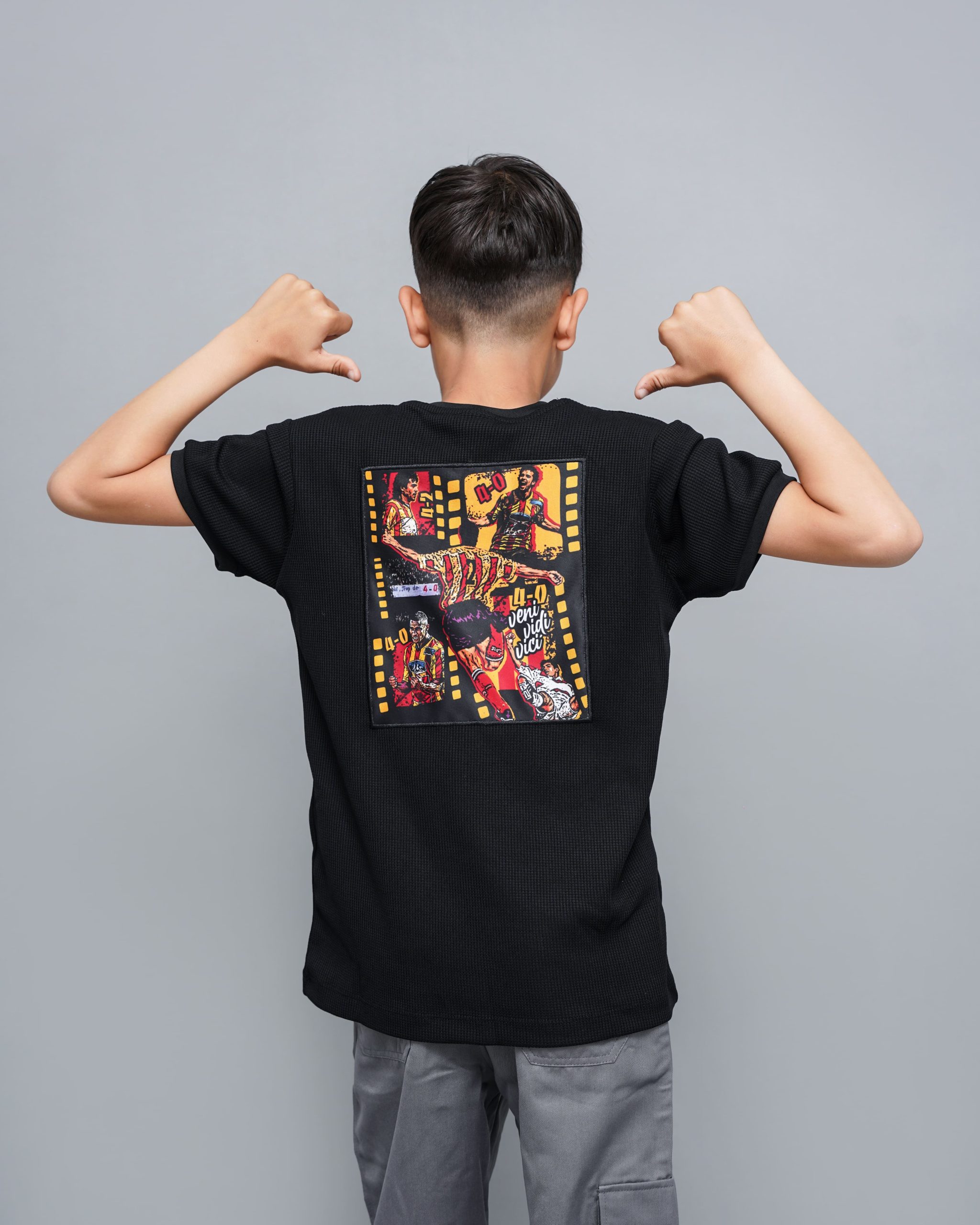 Le contraste entre le fond noir et l’inscription éclatante attire l’œil sans en faire trop. Par ailleurs, une étiquette tissée discrète en bas du t-shirt vient renforcer l’identité visuelle du produit. Ce look simple mais puissant séduit par son équilibre entre sobriété et originalité.
