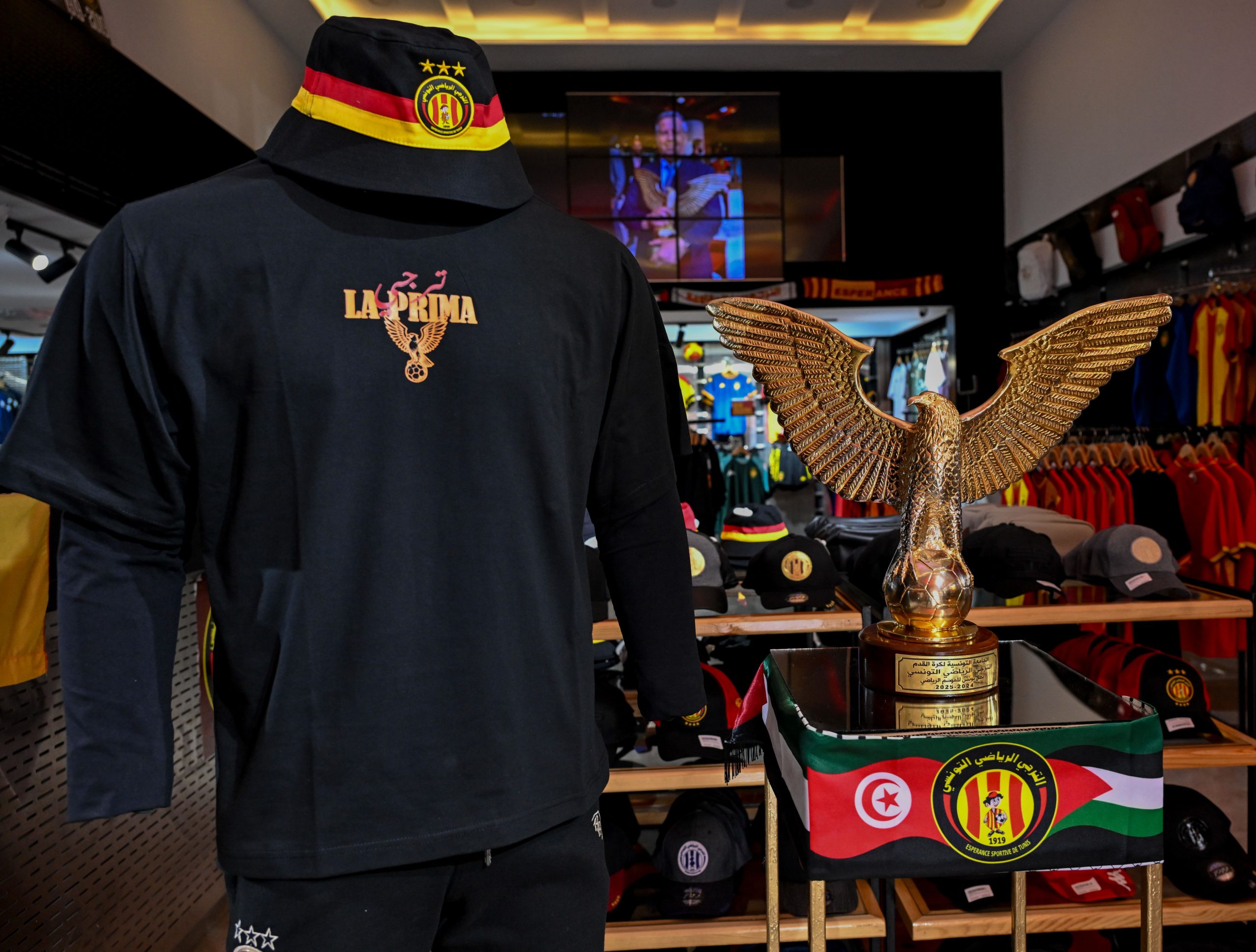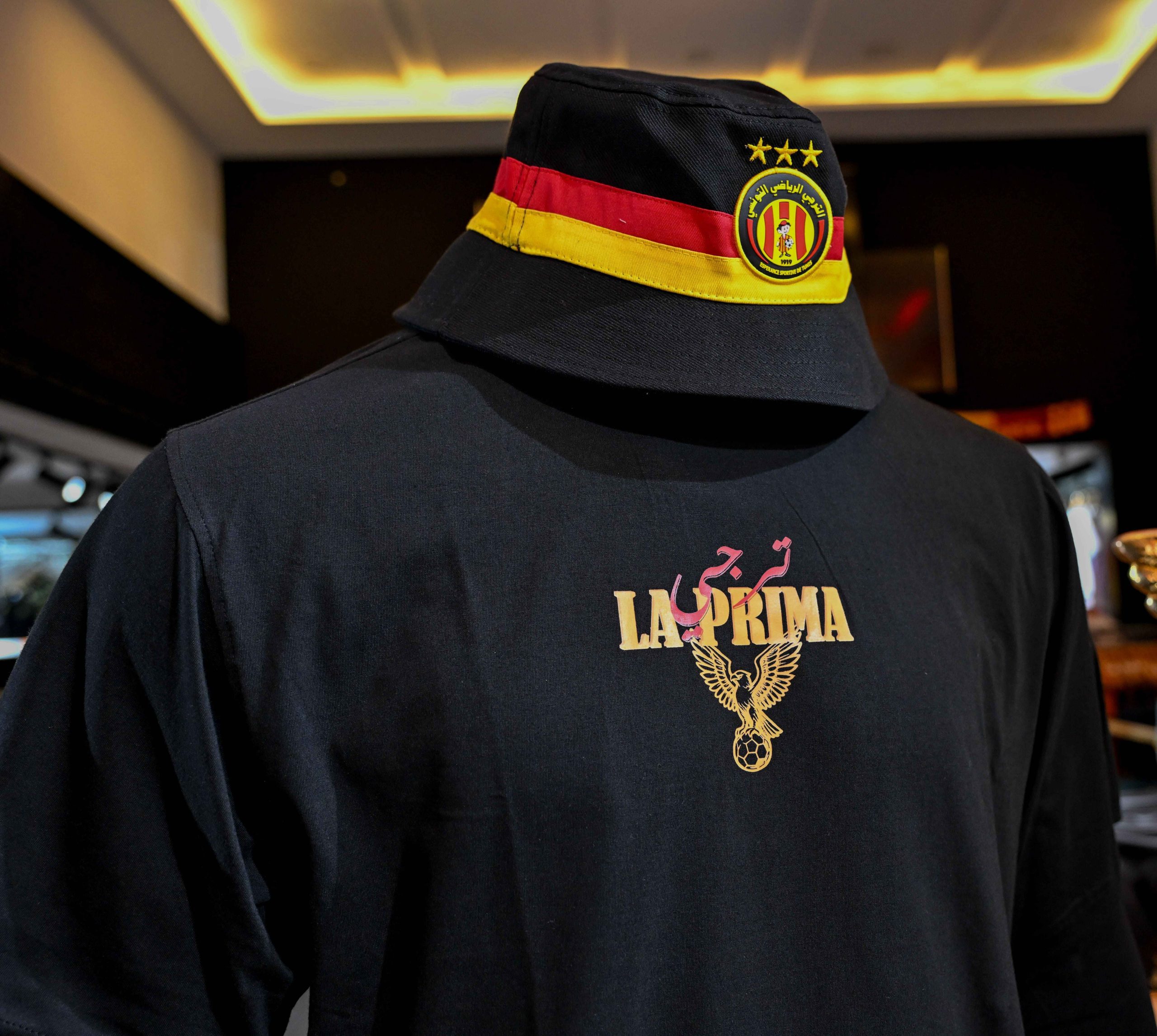 Sur la poitrine, on retrouve l’inscription “LA PRIMA” en lettres dorées, surmontée d’un majestueux aigle : un clin d’œil fort à l’identité du Taraji et à sa domination nationale. Le visuel est percutant, symbolique, et rend hommage à une nouvelle ligne gravée dans le palmarès du club.